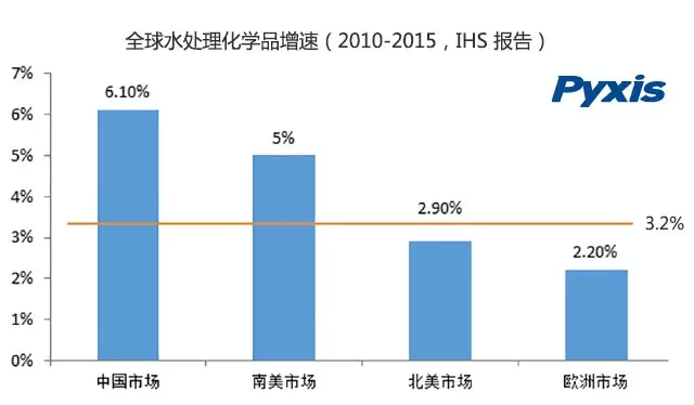 IHS化學(xué)公司日前的分析印證了這一點(diǎn)。其發(fā)布報(bào)告稱,2010~2015年,全球水處理化學(xué)品消費(fèi)量將以年均3.2%速度增長(zhǎng),市場(chǎng)規(guī)模將達(dá)約1240億美元。其中,中國(guó)市場(chǎng)年均需、求增速約為6.1%,南美增速預(yù)計(jì)為5%,北美增速約為2.9%,歐洲增速約為2.2%。